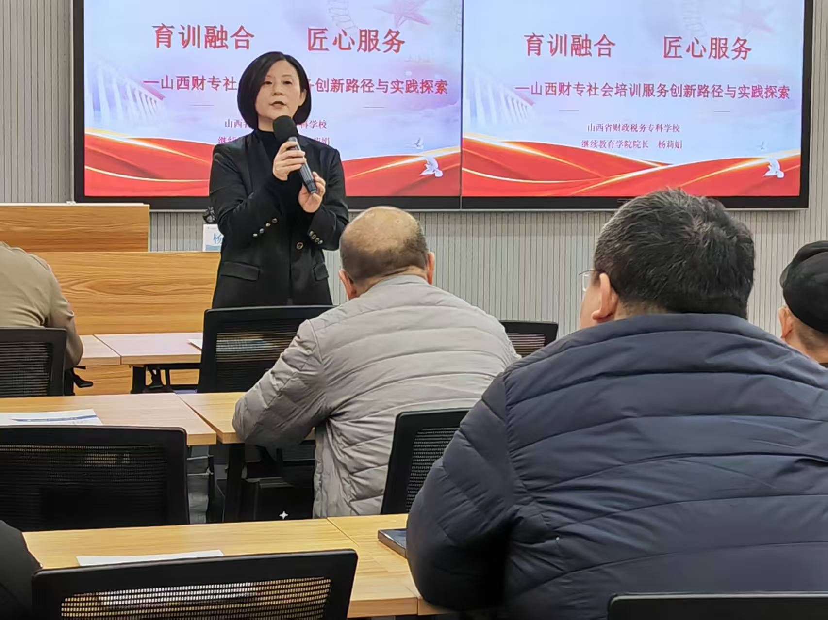 活动伊始,在综合实践中心411教室,继续教育学院院长杨莉娟向各位学员介绍了学校概况,组织观看了学校宣传片。在对学校有了初步的了解后,杨院长做了题为《育训融合 匠心服务-山西财专社会培训服务创新路径与实践探索》的专题交流报告,从非学历教育项目需求调研、培训模式创新、典型案例三个维度,深入阐述了学院如何围绕新时期、新任务实现转型发展,形成“校、企、行、政”深度合作,为区域经济建设高质量发展贡献了财专力量。
