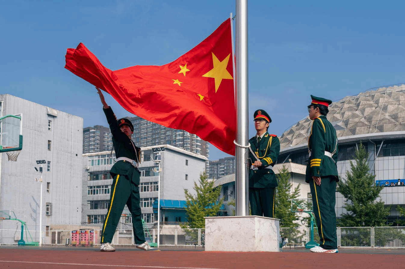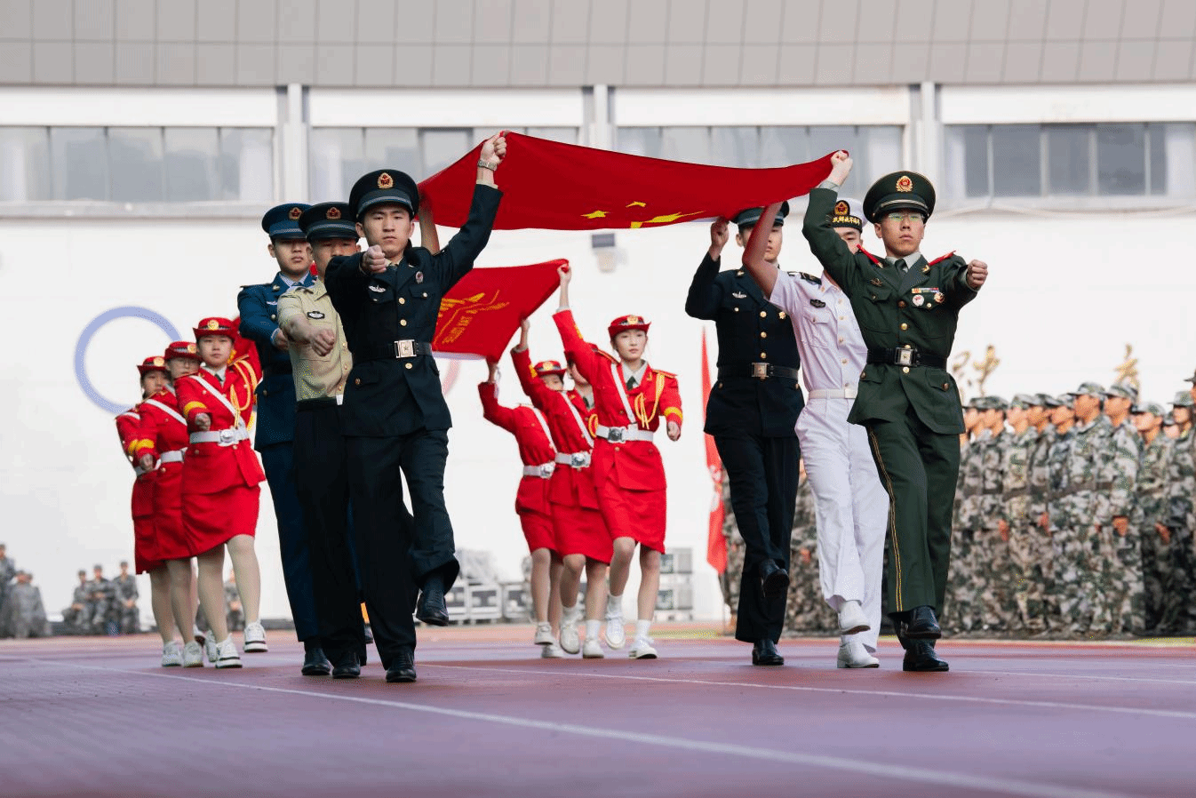 大会首先进行庄严的迎国旗、校旗仪式及分列式。新生方阵昂首阔步、精神抖擞,以挺拔姿态走过主席台,展现青春朝气。伴随着激昂的《义勇军进行曲》,鲜艳的五星红旗冉冉升起,全体师生肃立行注目礼,现场洋溢着浓厚的爱国爱校情怀。