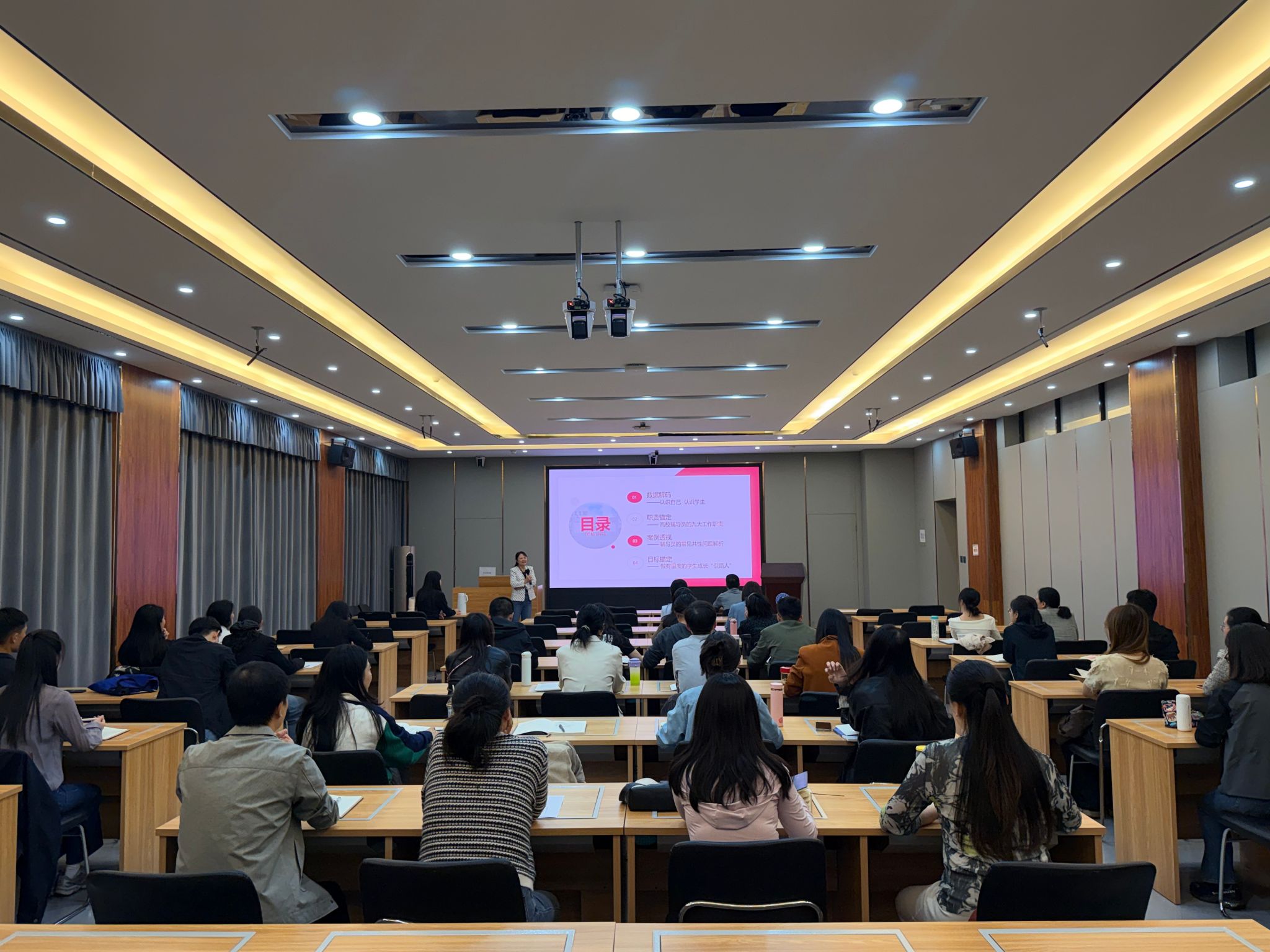 郭艳萍以“数据奠基——职责明晰——案例赋能——目标引领”为主线层层展开。开篇以调查问卷精准掌握25级辅导员情况,通过数据可视化呈现25级新生辅导员基本信息,为培训筑牢基础;在核心环节,郭艳萍首先以数据解码为引,对比24级与25级学生数据、剖析新生群体特征,明晰工作靶向;以职责剖析为要,明确辅导员角色定位、拆解九大工作职责,夯实履职根基;以案例透视为辅,聚焦辅导员常见共性问题、提供实践参考;最终以目标引领为宗旨,提出“做有温度的学生成长引路人”的核心方向,围绕“带好班级”提出了“立规矩、立新人、立flag”的具体路径,为新生辅导员开展工作构建了系统、全面的实践指南。