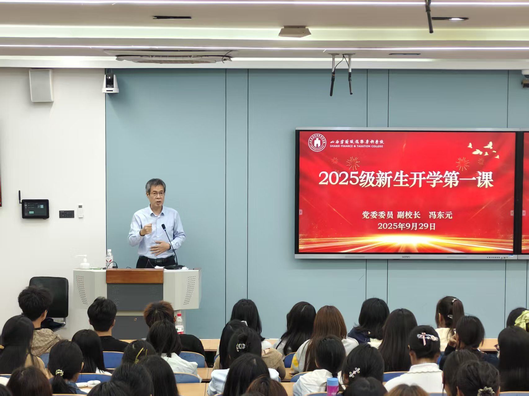 9月29日下午,党委委员、副校长冯东元在J307教室为金融学院2025级新生讲授“开学第一课”。