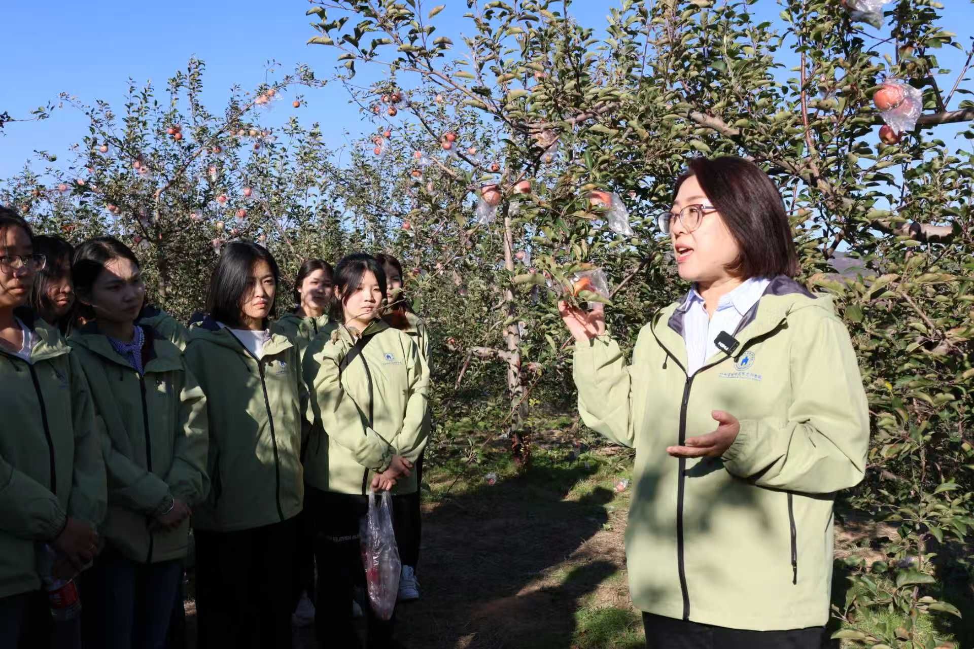 随后,师生们走进东林尖村果园与富硒果业综合服务中心,开展劳动实践与专业教学。数字商务学院郑洁老师将课堂直接搬到田间地头,以“溯源直播与农产品营销”为主题开展现场教学。“站在果园里讲直播,感觉完全不一样,学生们能看到苹果的生长环境,触摸到果实的质感,这种真实的体验感是任何教室里的PPT都无法替代的。我希望通过这样一堂课,让他们真正理解,如何为好的农产品讲出好故事,创造新价值。”郑洁老师感慨道。