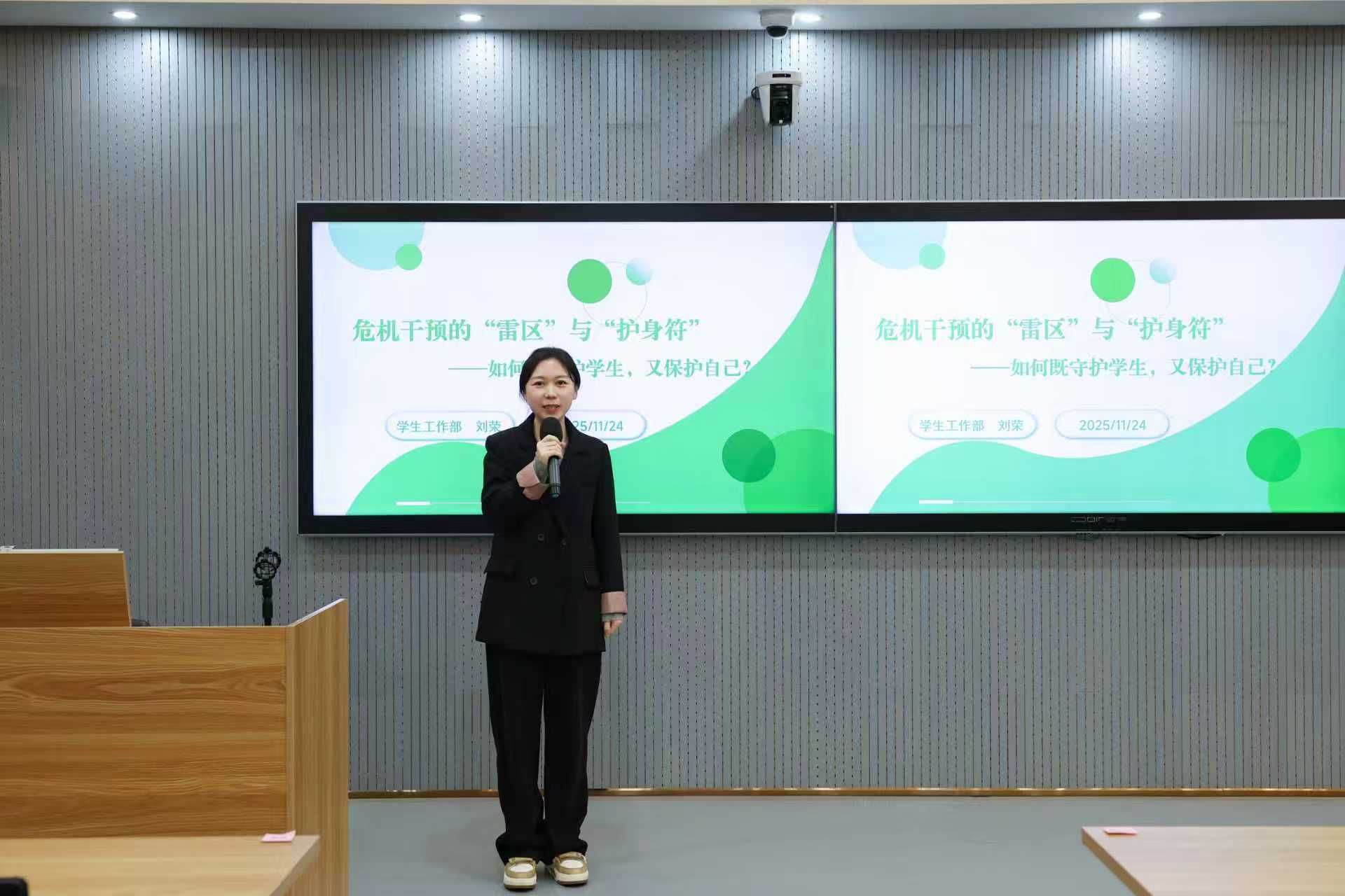 主题发言环节干货满满。刘荣围绕“危机干预的雷区与护身符——如何既保护学生,又保护自己”展开分享,结合实际案例剖析危机干预中的常见误区,详解科学应对策略与自我保护技巧,为教职工规避干预风险、提升处置能力提供实用指引;胡超则聚焦团体辅导的核心技术和流程,从方案设计、氛围营造到环节推进、效果评估,系统拆解团体辅导关键环节,助力教职工掌握开展团辅活动的核心方法。