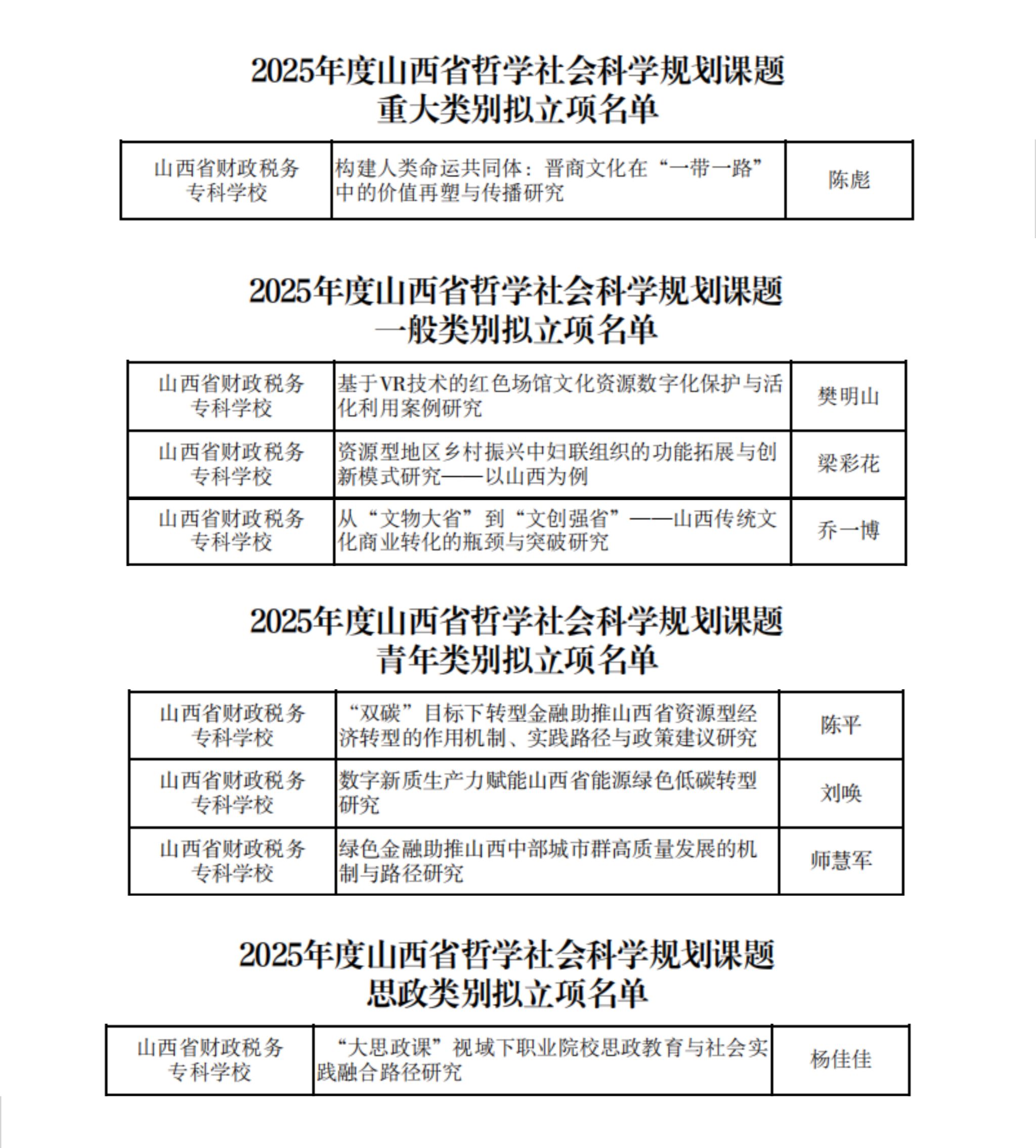 近日,山西省委宣传部公示了2025年度山西省哲学社会科学规划课题拟立项名单。我校获批哲学社会科学规划课题8项,其中重大课题1项、一般课题3项、青年课题3项、思政课题1项,立项数量位居全省高职院校首位。