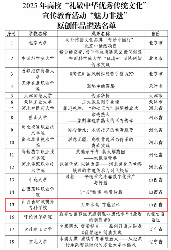 1月19日,教育部发布关于2025年高校“礼敬中华优秀传统文化”宣传教育活动结果的公示。我校报送的专题片《刀刻木韵 字蕴匠心》,经层层推荐与专家评审,成功入选“魅力非遗”类原创优秀作品。