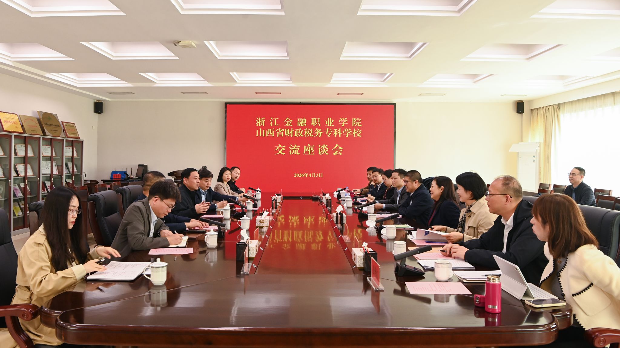 4月3日上午,浙江金融职业学院校长陈荣达一行来访我校。校长李赟鹏主持召开座谈会,相关部门负责人参加会议。