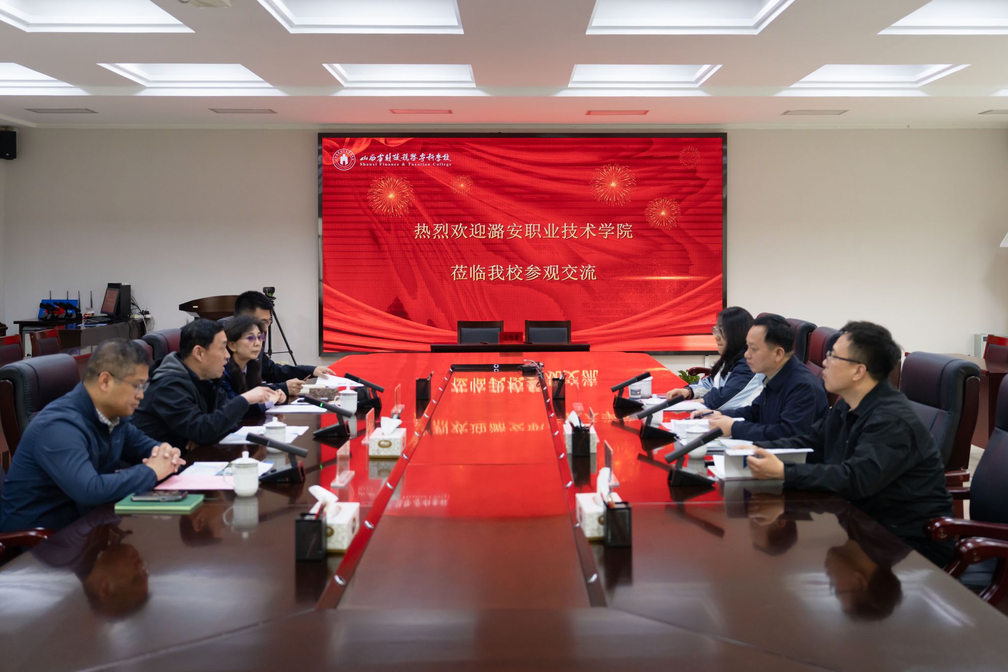 李赟鹏代表学校对潞安职业技术学院一行的到访表示热烈欢迎,简要介绍了我校的办学特色,重点分享了学校在社会服务、产教融合方面取得的成效,以及在外语教学和外事服务能力方面的特色优势。梁成忠介绍了潞安职业技术学院的总体情况,特别是社会服务和培训工作的整体布局、推进思路与主要成果。