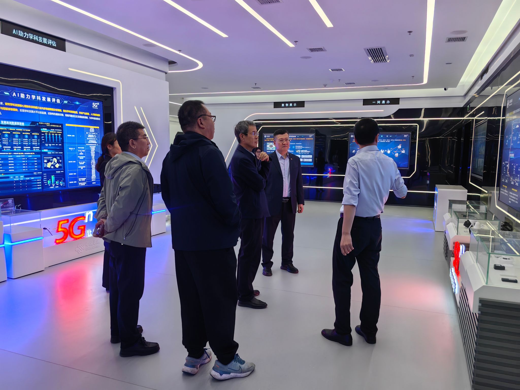 在山西联通常务副总经理、集团政企客户事业群山西分部常务副总裁杨金民等相关负责人的陪同下,我校参观团先后走进企业技术展示中心,重点观摩了人工智能技术创新应用、数字化教育解决方案、网络安全保障体系三大核心板块内容。