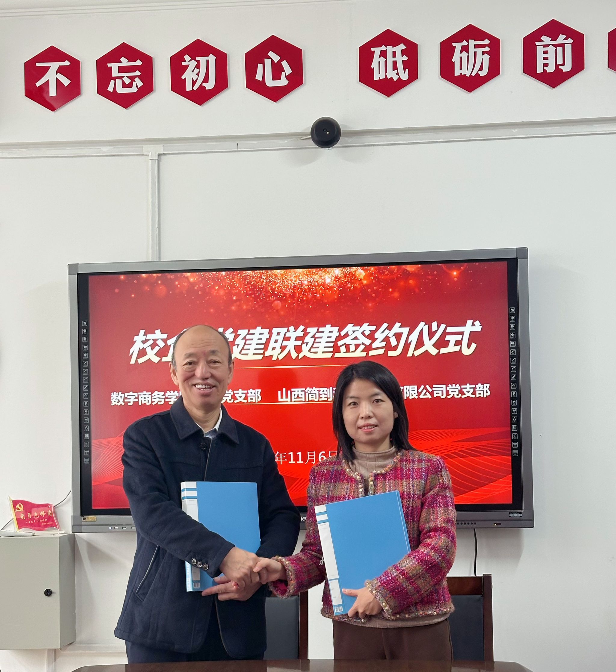 为深入学习贯彻党的二十届四中全会精神,11月6日,数字商务学院教师党支部与山西简到科技发展有限公司党支部(功能型)党建联建协议签字仪式在学院会议室举行。山西简到科技发展有限公司党支部书记、董事长周海明,总经理张筱彬,数字商务学院党总支负责人王方,教师党支部书记、副院长李越出席会议。李越与周海明共同签署校企党建联建协议。