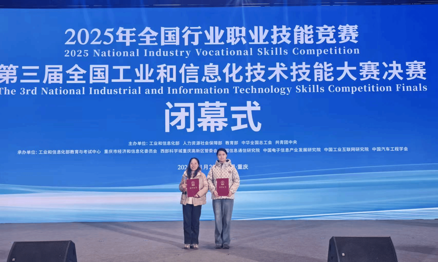 11月26-27日,由工业和信息化部、人力资源和社会保障部、教育部等五部门共同主办的2025年全国行业职业技能竞赛——第三届全国工业和信息化技术技能大赛决赛在重庆举行。该项赛事是我国工业和信息化领域级别最高、规模最大的国家级一类职业技能竞赛。我院选派教师郭子君、王栋娟代表参赛,与来自全国各地的顶尖技术能手同台切磋。经过层层激烈角逐与严格评审,我院教师最终荣获工业大数据赛项职工组全国三等奖。