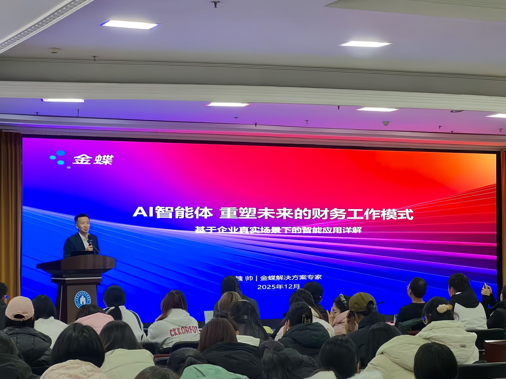 魏帅以“AI智能体重塑财务工作模式”为主题,从技术架构与数据流重构角度,系统阐释了传统财务向智能财务的演进路径。他指出,现代财务核心已转向“数据驱动”,AI与大数据技术成为实现实时分析、智能决策的关键引擎。结合制造、零售等行业案例,他深入解析了智能体在财务预测、风控管控、现金流优化等场景的应用逻辑,帮助学生理解数据建模、算法与业务价值的闭环关系。互动环节,学生围绕能力提升与职业发展踊跃提问。魏帅强调,技术人才需兼具专业深度与业务融合能力,在持续创新中实现个人与社会价值的统一。