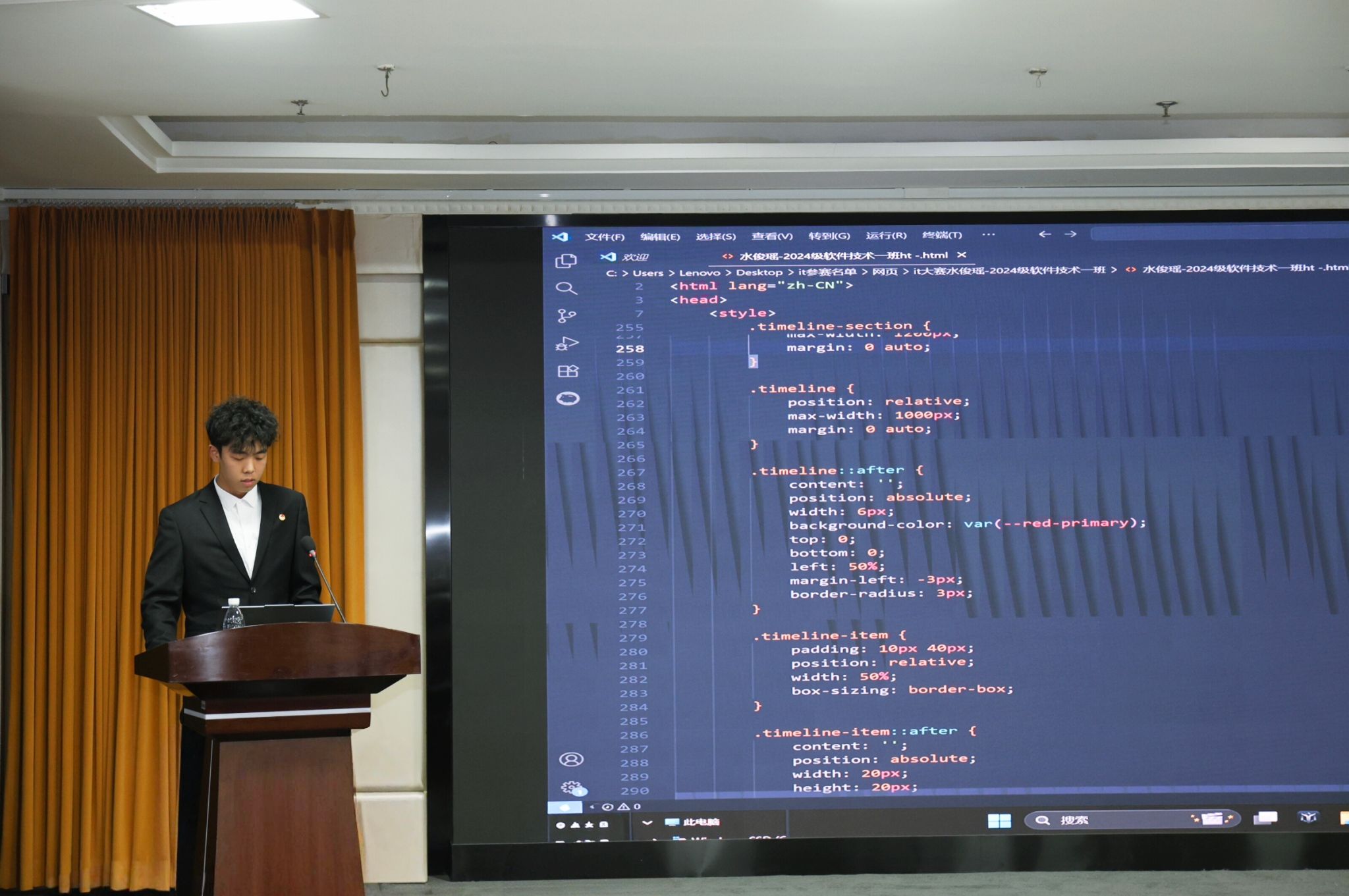 比赛现场,参赛选手们精神饱满、各显身手,凭借扎实的专业功底紧扣红色主题深耕创作,将炽热的家国情怀融入一行行代码、一幅幅设计之中,涌现出一大批兼具思想性与技术性的优质作品。其中,网页作品展示环节亮点纷呈,王超俊同学代表团队带来的三个项目尤为引人注目:每日穿搭集小程序彰显模块化架构与用户体验优化的工程思维;3D 姿态估计与动态捕捉项目实现图像关键点精准识别与动态追踪,展现前沿技术应用能力;Worldguesser 地理猜谜游戏创新融合地图 API 与游戏化设计,让知识学习变得生动有趣。三件作品集中诠释了现代技术项目 “以用户为中心” 的核心逻辑,充分彰显了信息学子卓越的创新思维与过硬的实践能力。经过初赛、复赛的层层筛选与决赛的激烈角逐,各赛项奖项逐一尘埃落定。最终,2025 级移动应用开发二班赵永胜斩获 PPT 比赛一等奖,2025 级软件技术一班王文琦摘得 logo 比赛一等奖,2025 级移动应用开发二班陈文静荣获 IP 形象比赛一等奖,2025 级计算机高本贯通一班陈宇鑫拿下院徽比赛一等奖,2024 级软件技术一班李舒楠获得海报比赛展示奖。