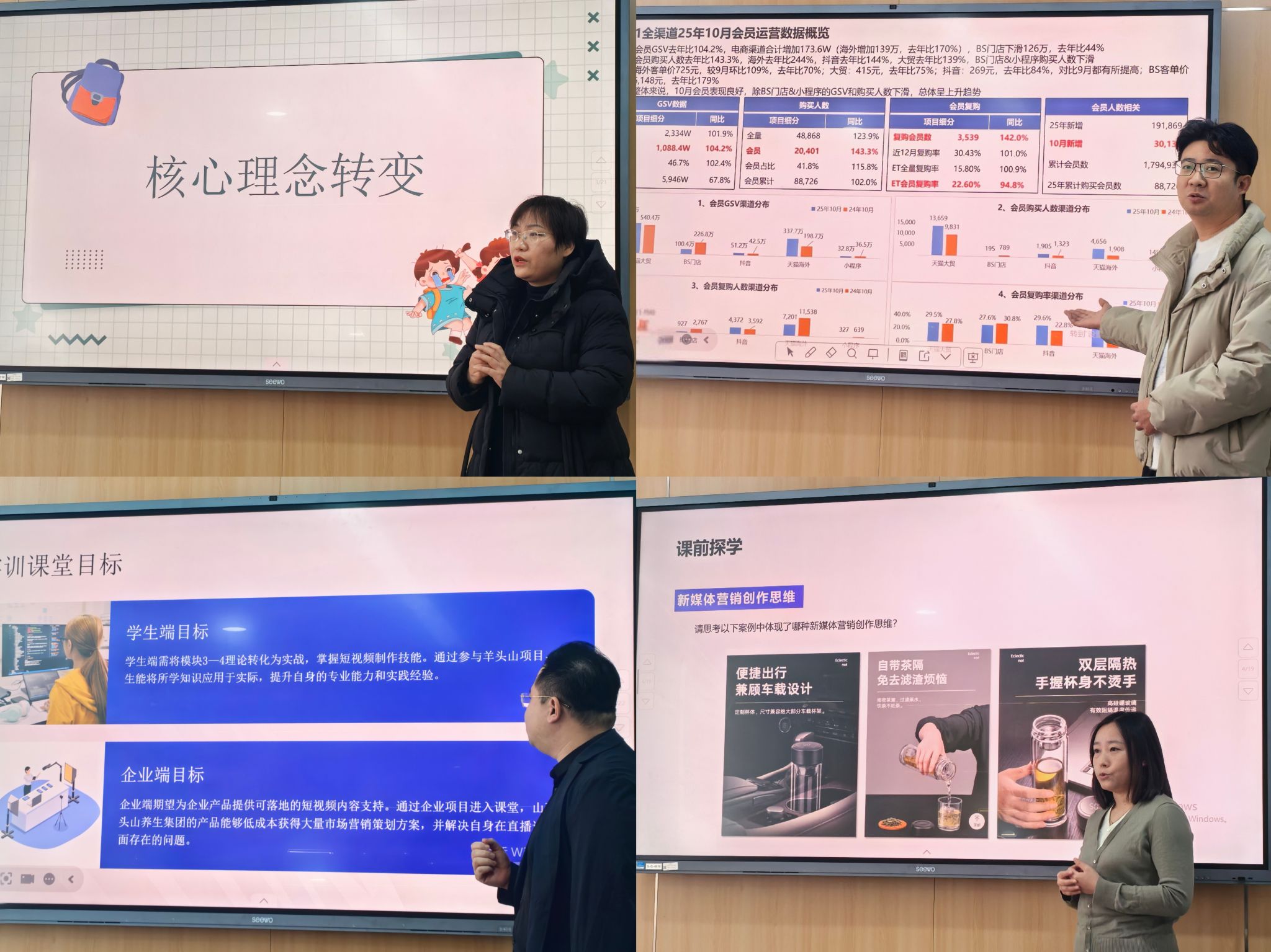 活动中,四位教师党员代表立足各自课程实践,分享了项目化教学的具体实施经验。梁彩花围绕“项目驱动、学做合一”的教学理念,阐释了在授课过程中如何通过任务导入、过程指导与复盘总结三大环节,构建以产出真实价值为导向的课堂教学生态。王智结合“正官庄”品牌会员运营真实案例,解析了如何借助数据分析与营销策划任务,阶梯式提升学生应对实际问题的能力。李翀依托“山西羊头山养生产业有限公司”校企合作项目,展示了如何以企业真实需求为导向,组织学生完成从策划、视频拍摄到直播的全流程实训,提升岗位综合技能。杨文茹以《新媒体营销》课程为例,着重介绍了如何通过图文策划、短视频创作等课堂任务,系统引导学生将理论知识转化为实践能力。李越强调,全体党员教师要主动作为,每人必须结对一位行业专家,当好产教融合的“桥头堡”,全力把企业真实项目与场景“引进来”,让课堂体验“活起来”,有效激发学生的内生动力,在“做中学、学中做”的闭环中,扎实培养学生的完整职业行动能力。