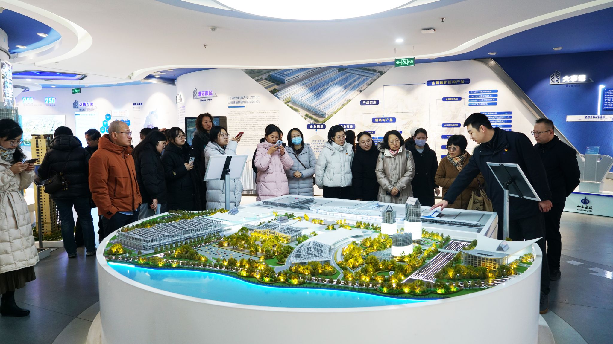 走进山西钢构科工,仿佛置身一座现代化的“钢铁智慧岛”。在公司本部党支部书记、组织人事部部长陈新昊及党建工作部负责人李少陆的引导下,党员干部们深入智能展示中心、钢结构与高端金属围护结构制造车间学习参观。这里不见传统工地的尘土飞扬,取而代之的是焊接机器人挥舞机械臂的精准律动,以及BIM技术全流程数字化管理带来的“指尖上的建造”。