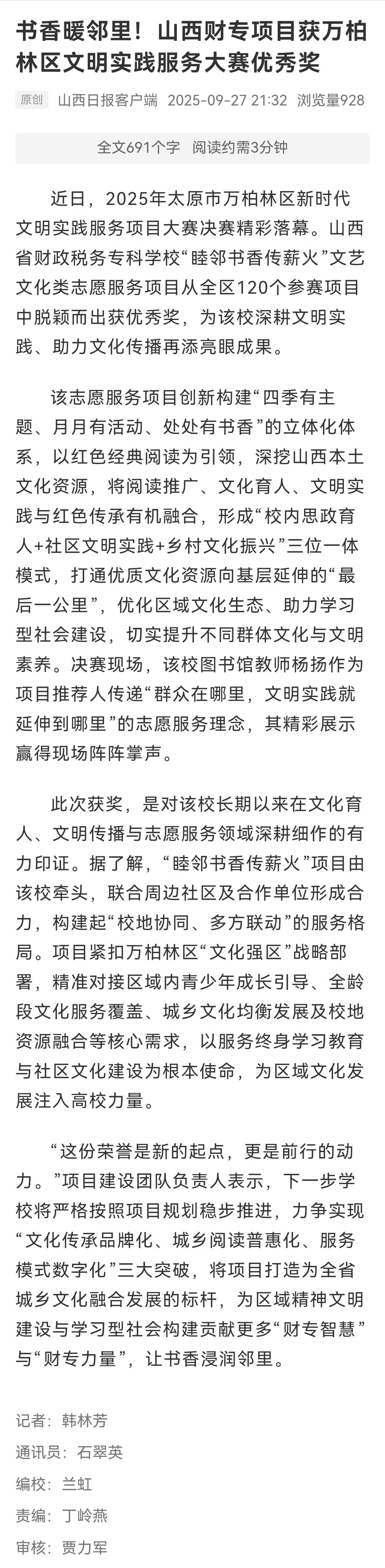 山西日报:书香暖邻里!山西财专项目获万柏林区文明实践服务大赛优秀奖