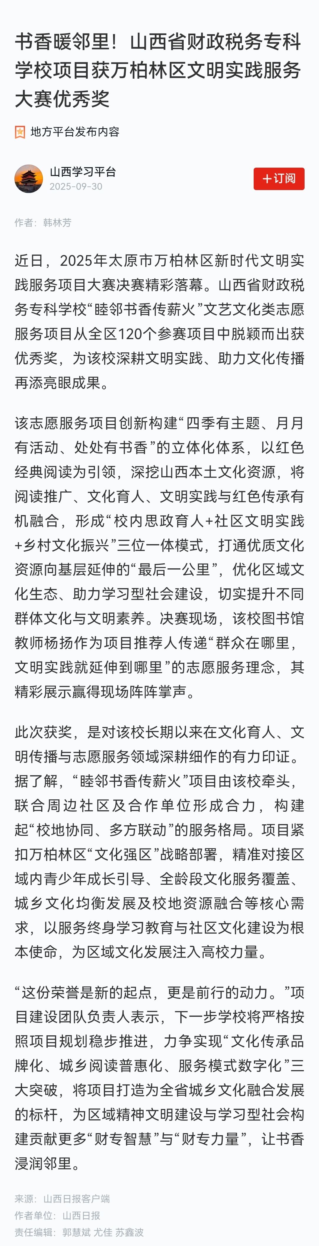 学习强国:书香暖邻里!山西省财政税务专科学校项目获万柏林区文明实践服务大赛优秀奖