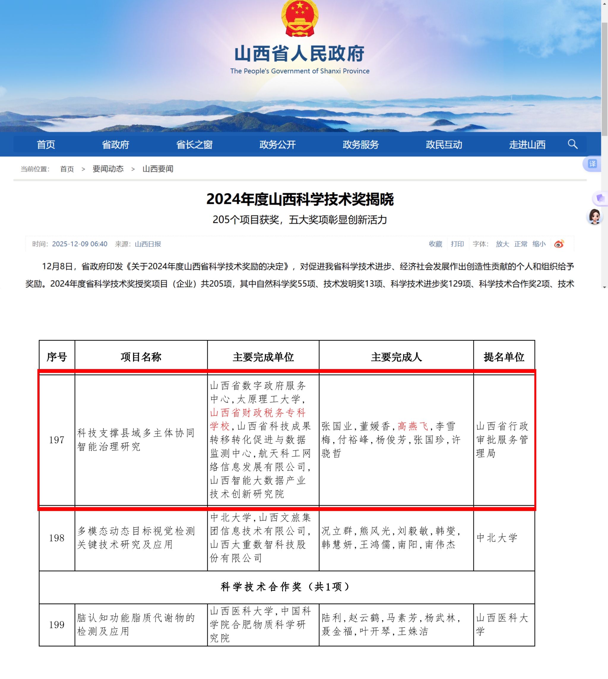 12月8日,山西省政府印发《关于2024年度山西省科学技术奖励的决定》,对促进我省科学技术进步、经济社会发展作出创造性贡献的个人和组织给予奖励。2024年度省科学技术奖授奖项目(企业)共205项,我校作为主要完成单位,高燕飞老师作为主要完成人的项目“科技支撑县域多主体协同智能治理研究”荣获科学技术进步奖二等奖,实现了学校在省级科技奖领域的重大突破。