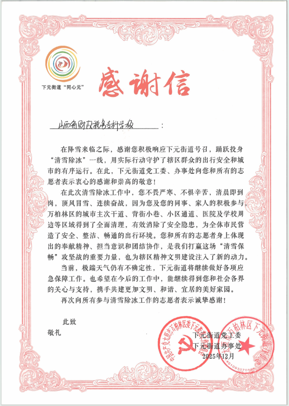 近日,我校收到来自下元街道党工委、办事处的一封感谢信,信中对我校师生在近期清雪除冰工作中的积极参与和无私奉献表示诚挚感谢。
