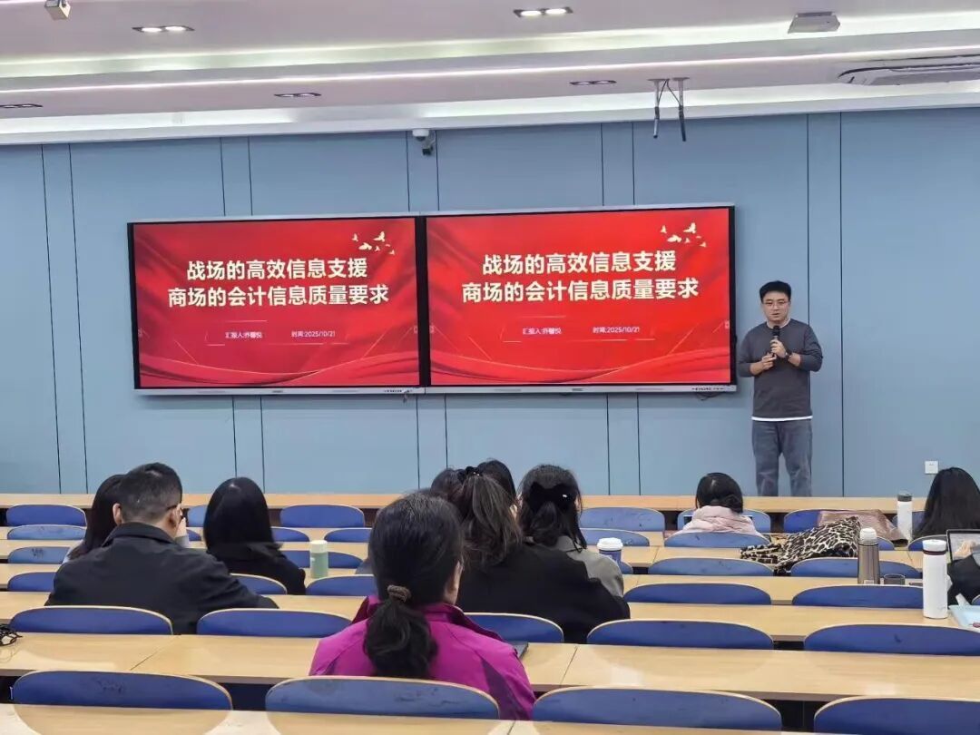 2025年10月21日下午我院教师党支部开展课程思政示范课主题党日活动。本次活动由党员教师乔馨悦老师主讲,主题为“战场的高效信息支援,商场的会计信息质量要求”,我院教师党支部全体党员参加。