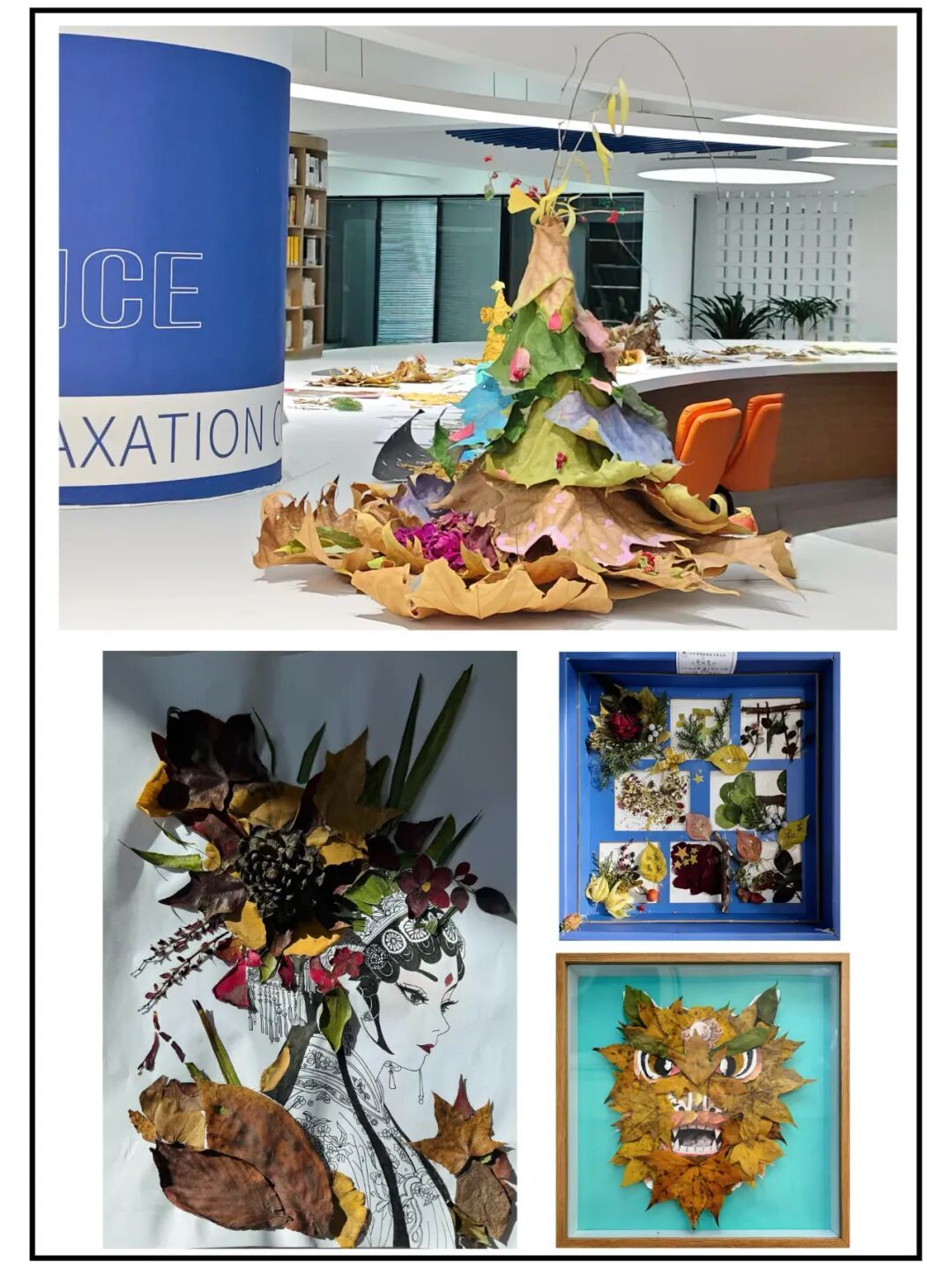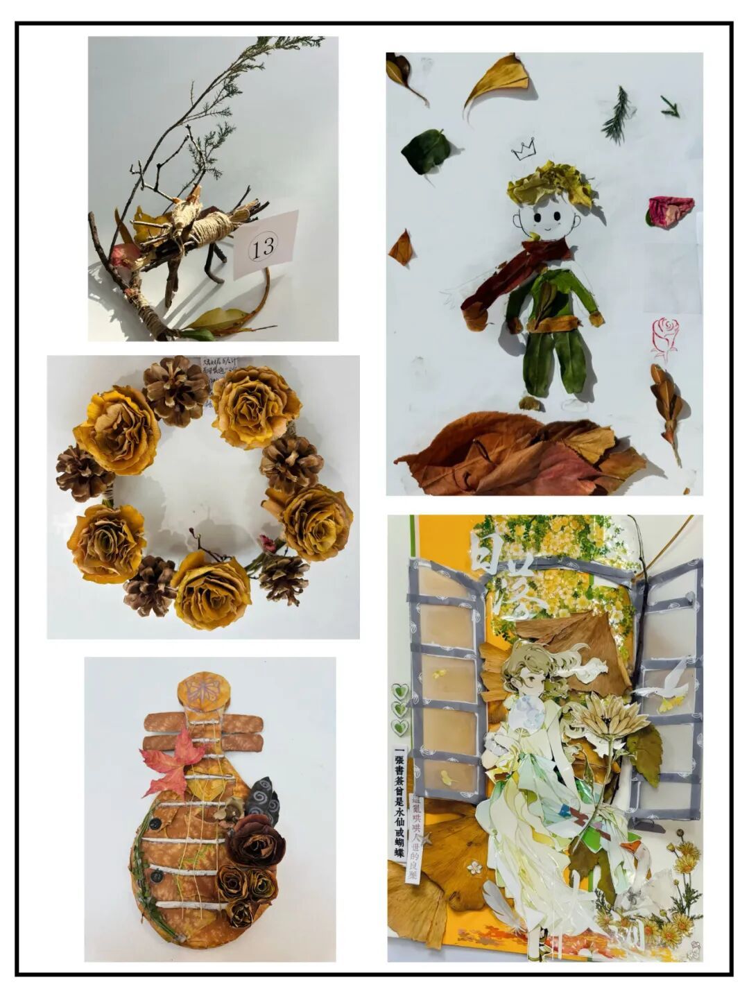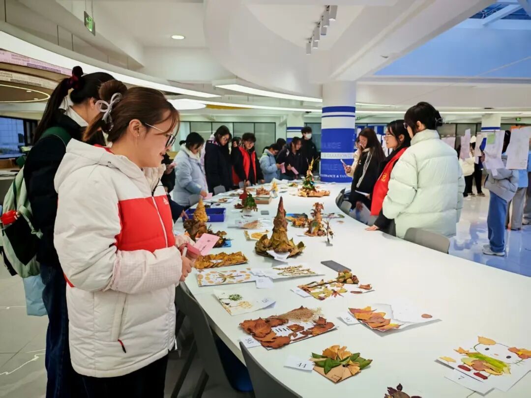 活动中,同学们以落叶为创作媒介,尽情释放想象力与创造力,打造出形式多元的艺术作品:既有以落叶拼贴成山水、动物、花卉等意象的创意贴画,也有以落叶为基底搭建的立体造型,更有融入丝带、彩绳、干花等元素的特色手作饰品。每一件作品皆凝聚着同学们的动手能力与创新思维,尽显创意才情与审美素养,成为我院美育实践的鲜活成果。我院于11月21日在大学生创新创业中心组织了作品展示活动,这些凝结着青春智慧的创作,将飘落的树叶转化为跃动的艺术精灵,构筑起一场视觉盛宴,经由学生现场投票评选,《落叶是秋天的魔法》《秋梧戏韵》等9件作品脱颖而出,荣获一、二、三等奖。