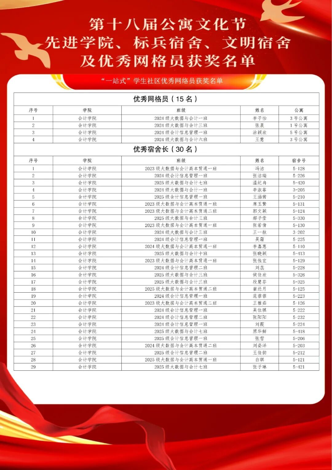 “寓”见青春,“宿”说精彩!学校第十八届公寓文化节顺利落下帷幕。本届文化节深耕校园文化与公寓文明建设,助力学生成长成才。我院积极参与、硕果累累,荣获公寓管理“先进学院”称号,10个班级获评“优秀班集体”、49个宿舍获评“标兵宿舍”、24个宿舍获评“文明宿舍”,五号公寓辅导员工作站入选优秀“一站式”学生社区辅导员工作站。此外,4名同学获评优秀网格员,29名同学获评优秀宿舍长,19个宿舍的作品荣获优秀作品奖。