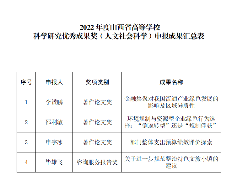 根据山西省教育厅《关于组织申报2022年度山西省高等学校科学研究优秀成果奖(人文社会科学)的通知》安排,经个人申请,我校共4人申报,其中著作论文奖3项,咨询服务报告奖1项,现予以公示。公示时间自即日起至1月16日。如有异议,请于公示期内向科研服务中心或相关部门反映。