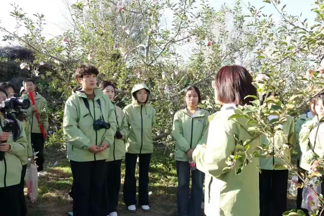在东林尖树果园,实践活动迎来“实战环节”。当地果农详细介绍了本地苹果的品种特性与生长优势后,郑洁老师向同学们传授溯源直播技巧,随后全体师生拿起工具,协助果农采摘苹果,在亲手劳作中体会劳动艰辛,树立正确劳动观。离开果园,师生们又参观了西南舁乡富硒果业综合服务中心,通过展板与实物展示,清晰了解到当地果园从0到1.2万亩的发展变迁,以及苹果产业的天然优势与品牌建设成果。据悉,该苹果产业已成为当地群众增收致富的核心支柱,为乡村全面振兴筑牢产业根基,也为推动中国式现代化提供了基层实践样本。