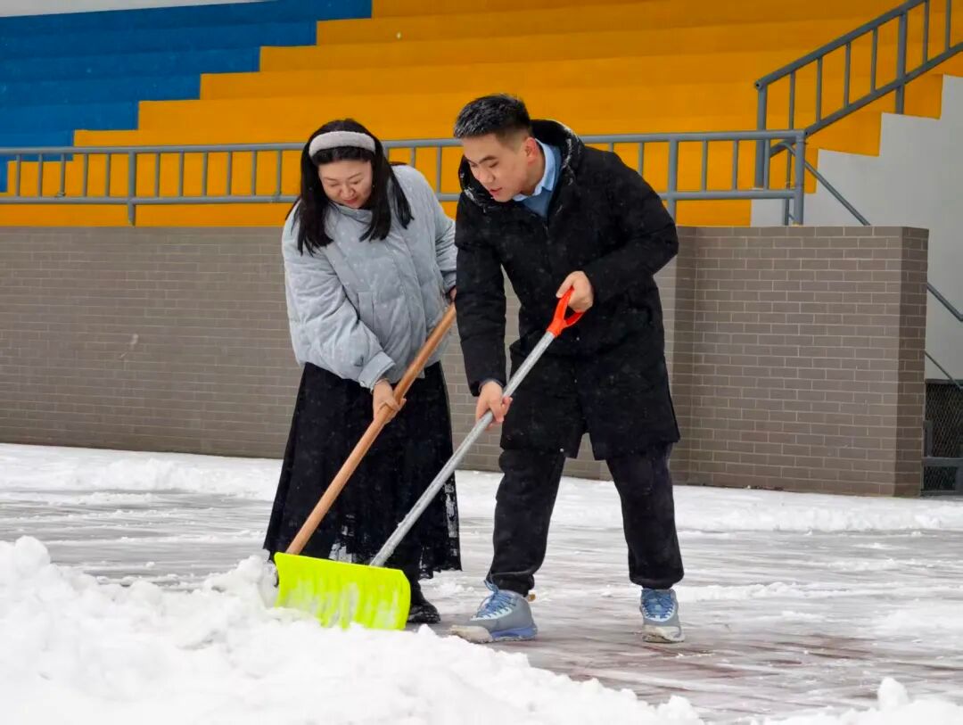 教师率先垂范,温暖同行寒风凛冽中,由程瑞萍书记、柳菁老师,刘亮亮老师等组成的教师队伍率先垂范,挥舞着铁锹对人行道上的厚冰进行集中破除。现场老师一边示范标准动作,一边反复强调清雪规范。“大家注意脚下,别滑倒了”,老师们一句句温暖的叮嘱,让寒冷的冬日充满了暖意。用行动诠释着“学高为师,身正为范”的担当,为同学们树立了责任担当的榜样。用行动诠释着“学高为师,身正为范”的担当,为同学们树立了责任担当的榜样。