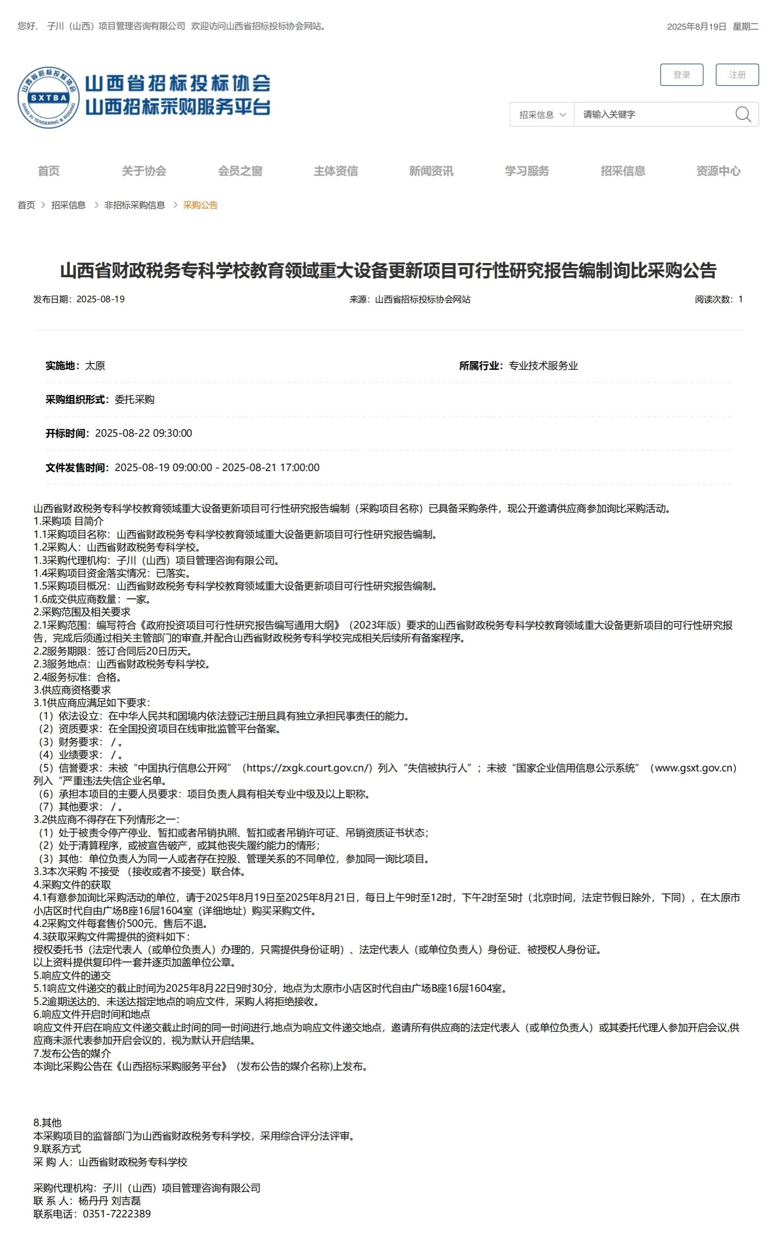 2025年8月19日,子川(山西)项目管理咨询有限公司受我校委托,对我校“教育领域重大设备更新项目可行性研究报告编制”项目发布了采购公告,山西省招标投标协会网关于本项目公告如下: