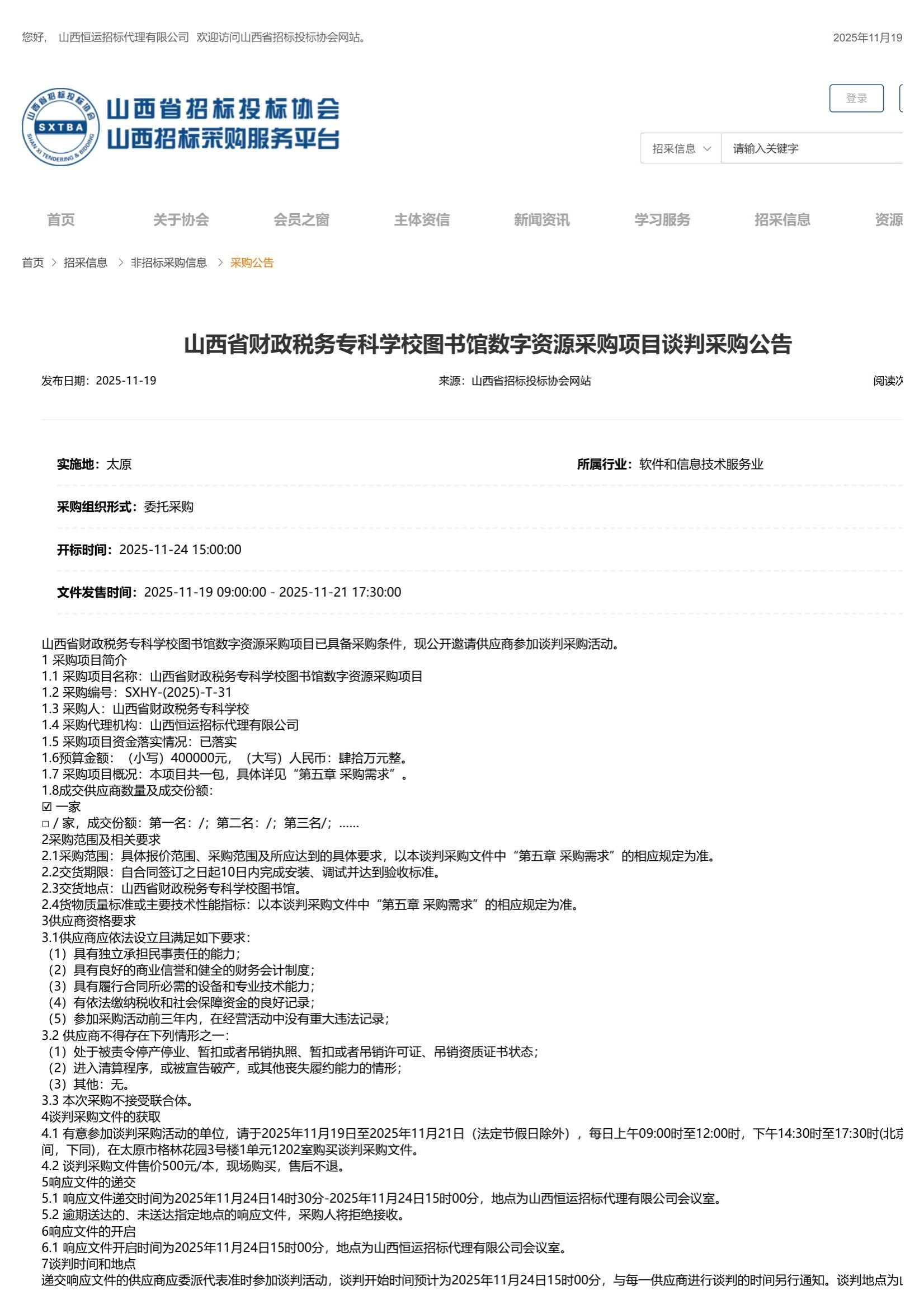 2025年11月19日,山西恒运招标代理有限公司受我校委托,对我校“图书馆数字资源采购”项目发布了采购公告,山西省招标投标协会网关于本项目公告如下: