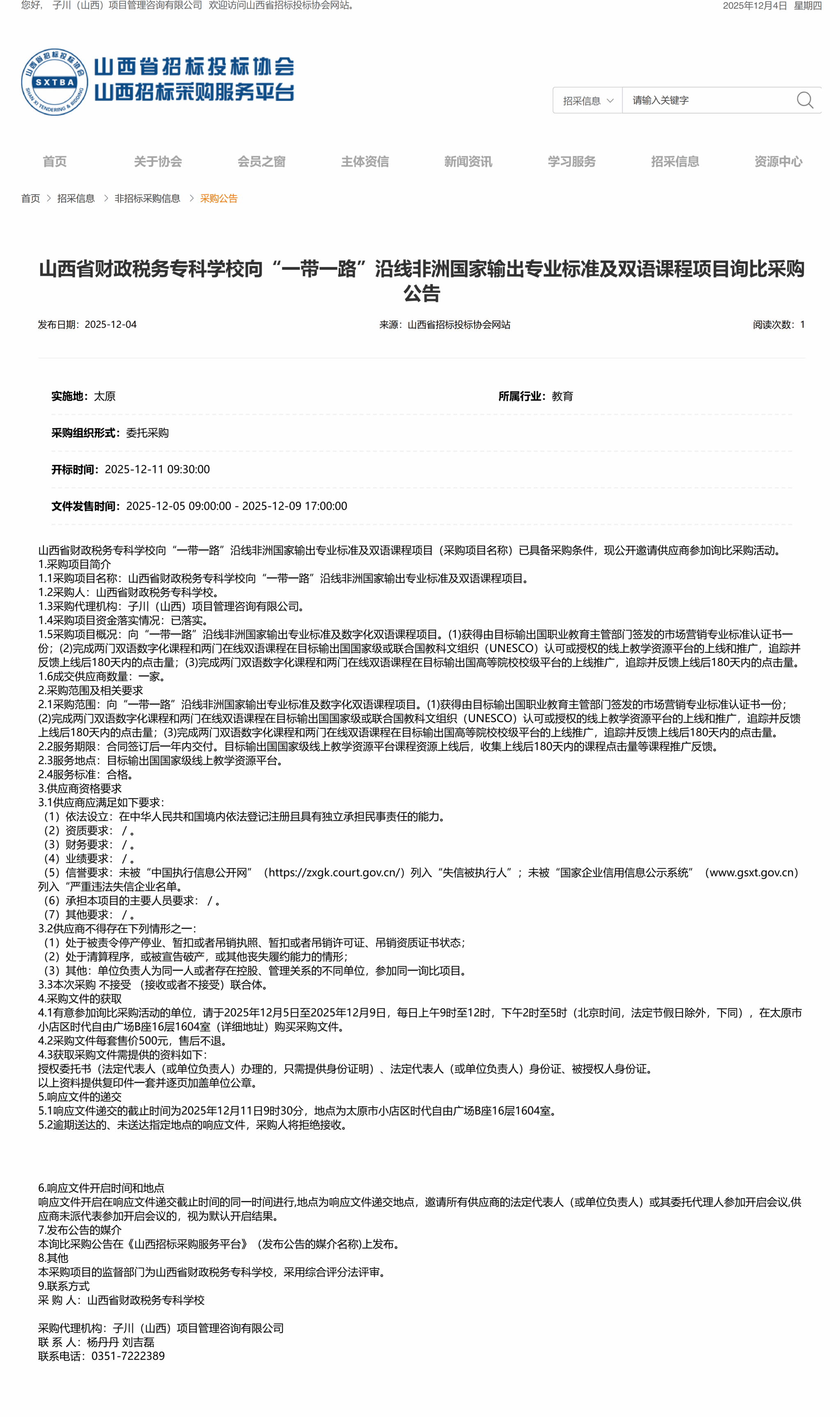 2025年12月4日,子川(山西)项目管理咨询有限公司受我校委托,对我校““一带一路”沿线非洲国家输出专业标准及双语课程”项目发布了采购公告,山西省招标投标协会网关于本项目公告如下: