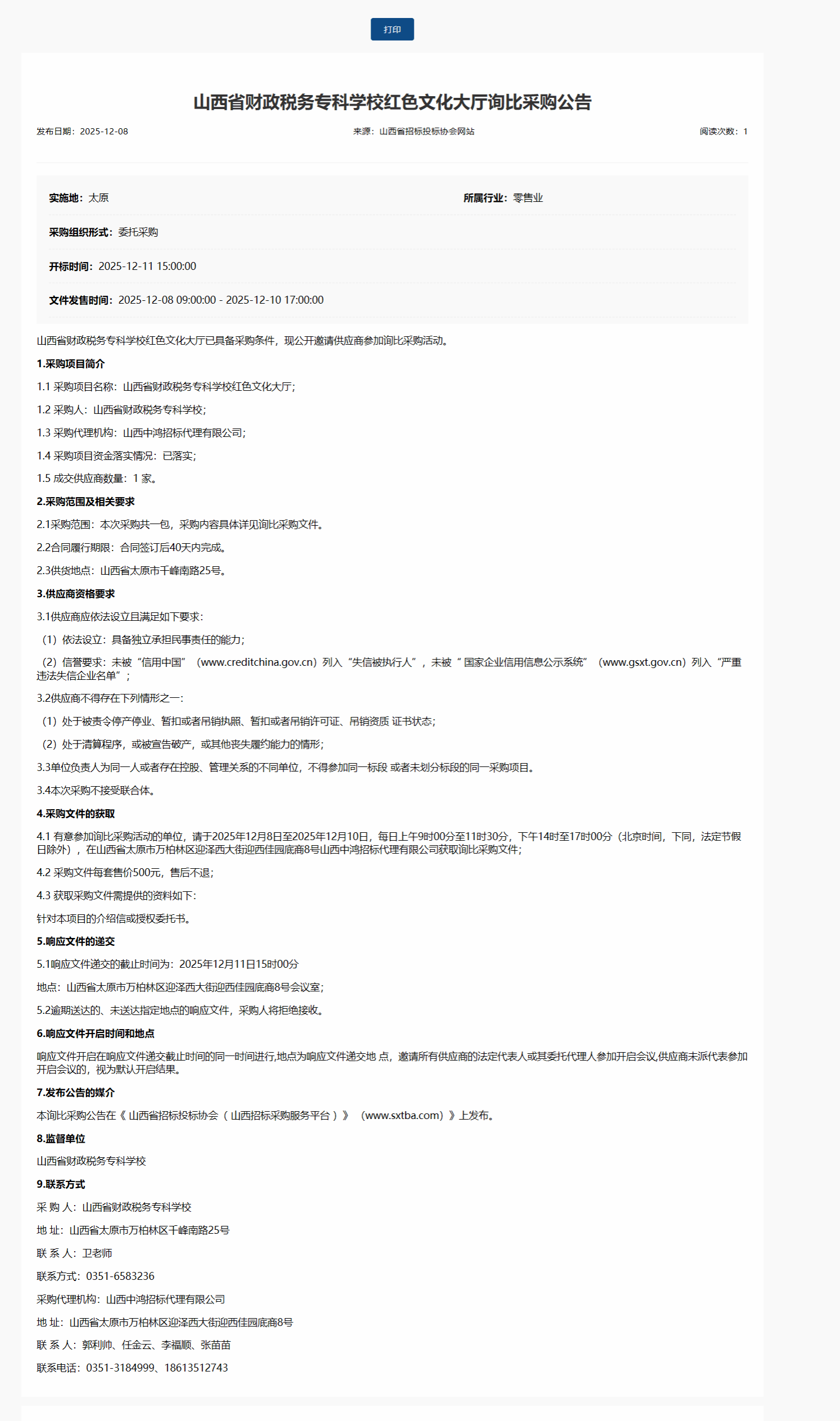 我校委托,对我校“红色文化大厅”项目发布了采购公告,山西省招标投标协会网关于本项目公告如下: