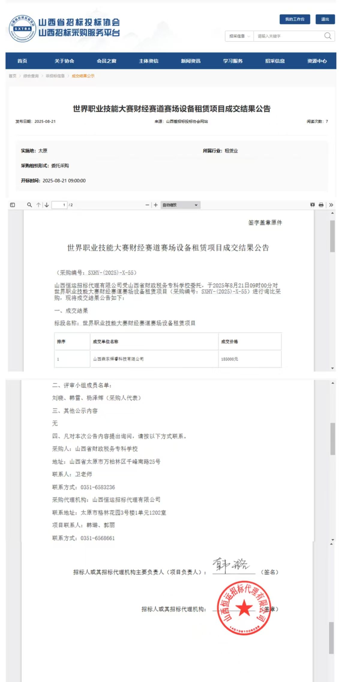 2025年8月21日,山西恒运招标代理有限公司受我校委托,对我校“世界职业技能大赛财经赛道赛场设备租赁”项目进行招标采购。 并于2025年8月21日完成评审工作。 山西省招标投标网关于本项目成交结果公告如下: