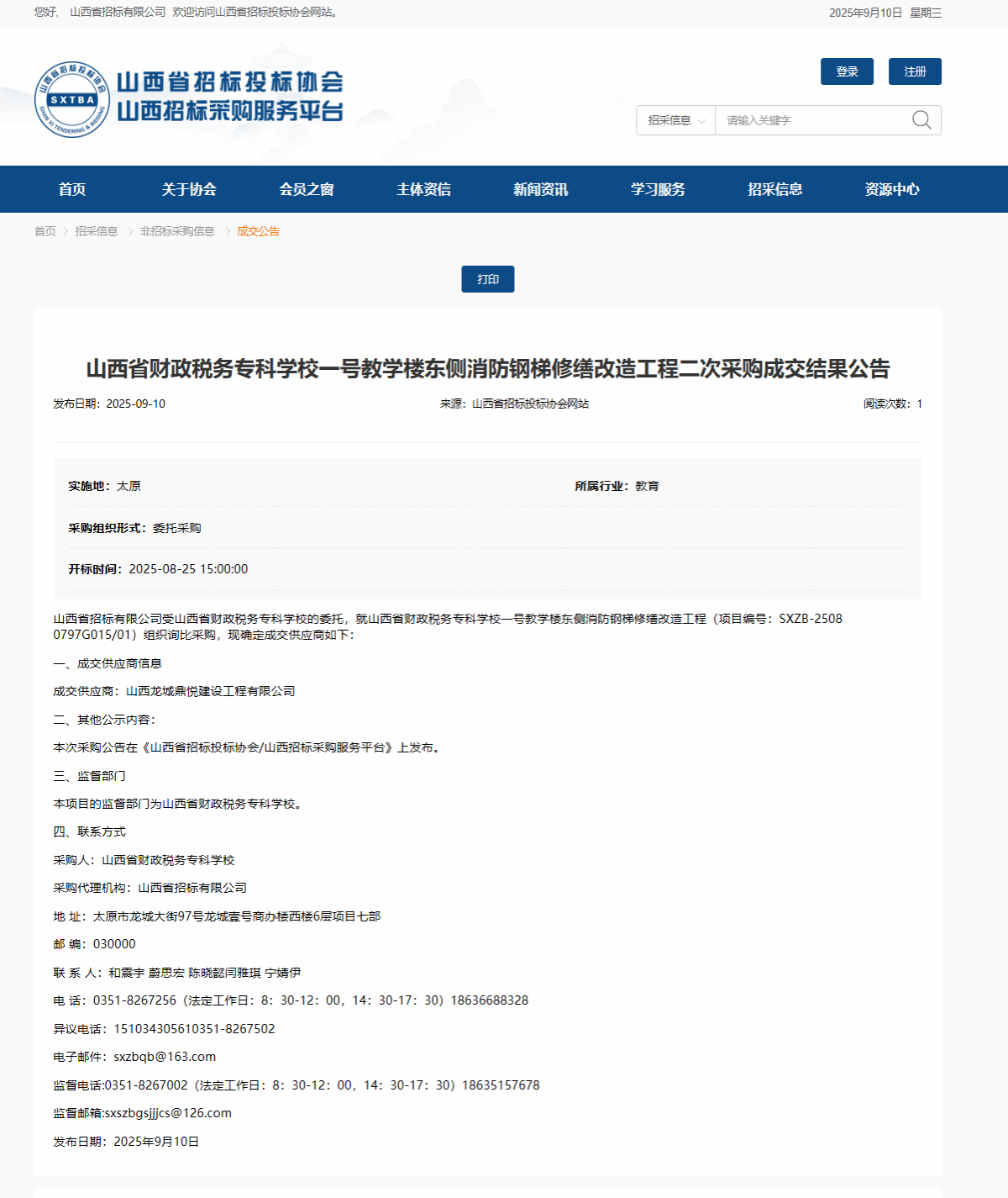 2025年8月25日,山西省招标有限公司受我校委托,对我校“一号教学楼东侧消防钢梯修缮改造工程”项目进行招标采购。 并于2025年9月10日完成评审工作。 山西省招标投标协会网关于本项目成交结果公告如下:
