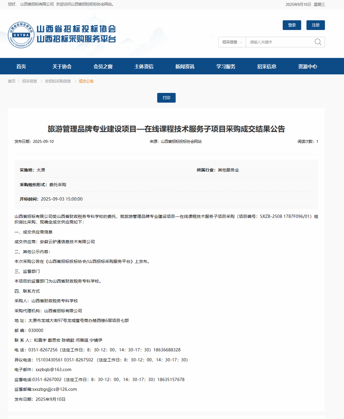 2025年9月3日,山西省招标有限公司受我校委托,对我校“旅游管理品牌专业建设项目——在线课程技术服务子项目”进行招标采购。 并于2025年9月10日完成评审工作。 山西省招标投标协会网关于本项目成交结果公告如下: