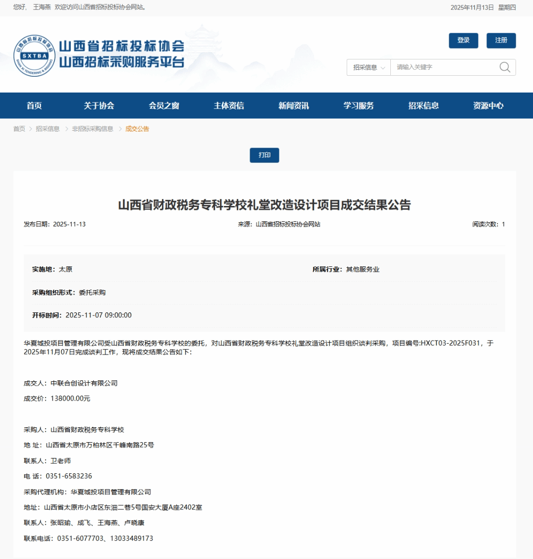 2025年11月4日,华夏城投项目管理有限公司受我校委托,对我校“礼堂改造设计”项目进行招标采购。 并于2025年11月7日完成评审工作。 山西省招标投标协会网关于本项目成交结果公告如下: