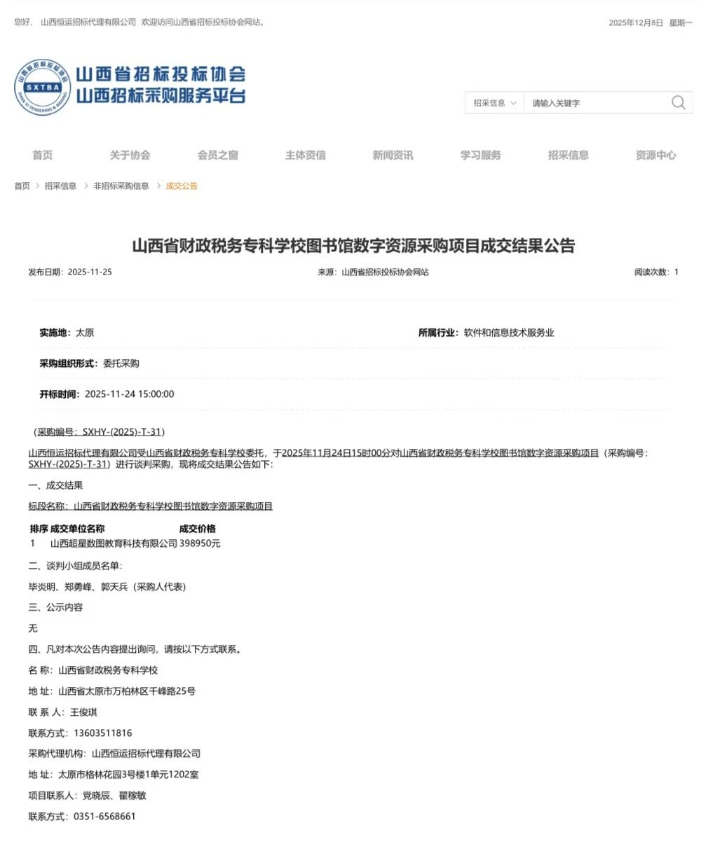 2025年11月19日,山西恒运招标代理有限公司受我校委托,对我校“图书馆数字资源采购”项目进行招标采购。 并于2025年11月25日完成评审工作。山西省招标投标协会网关于本项目成交结果公告如下: