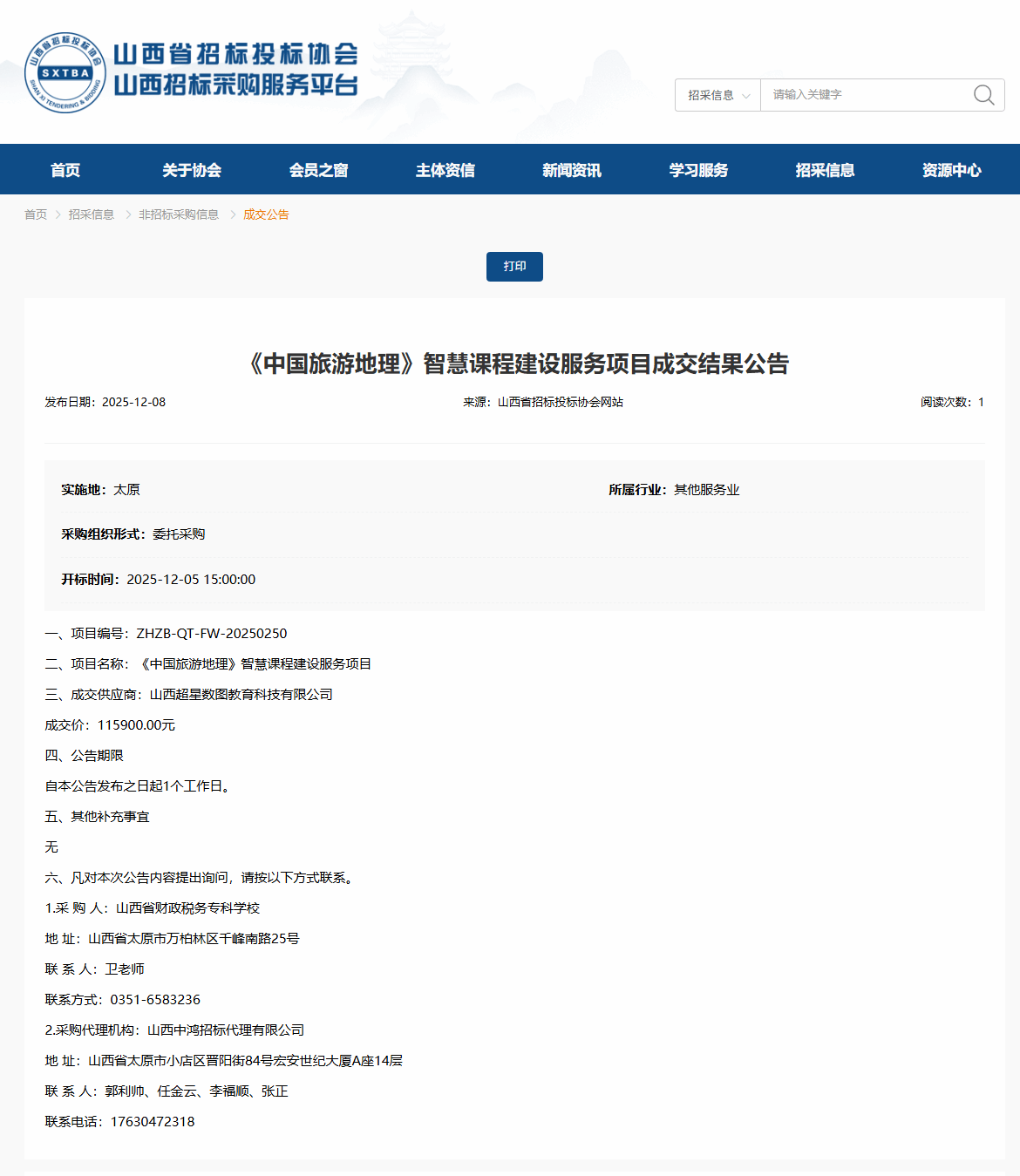 2025年12月2日,山西中鸿招标代理有限公司受我校委托,对我校“《中国旅游地理》智慧课程建设服务”项目进行招标采购。 并于2025年12月8日完成评审工作。 山西省招标投标协会网关于本项目成交结果公告如下: