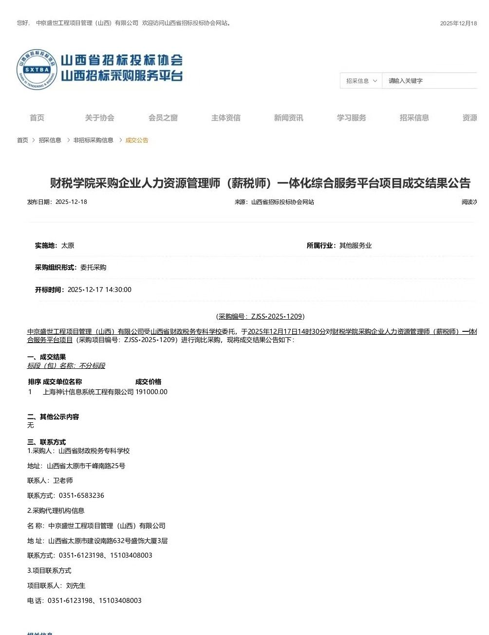 2025年12月12日,中京盛世工程项目管理(山西)有限公司受我校委托,对我校“财税学院采购企业人力资源管理师(薪税师)一体化综合服务平台”项目进行招标采购。 并于2025年12月18日完成评审工作。 山西省招标投标协会网关于本项目成交结果公告如下: