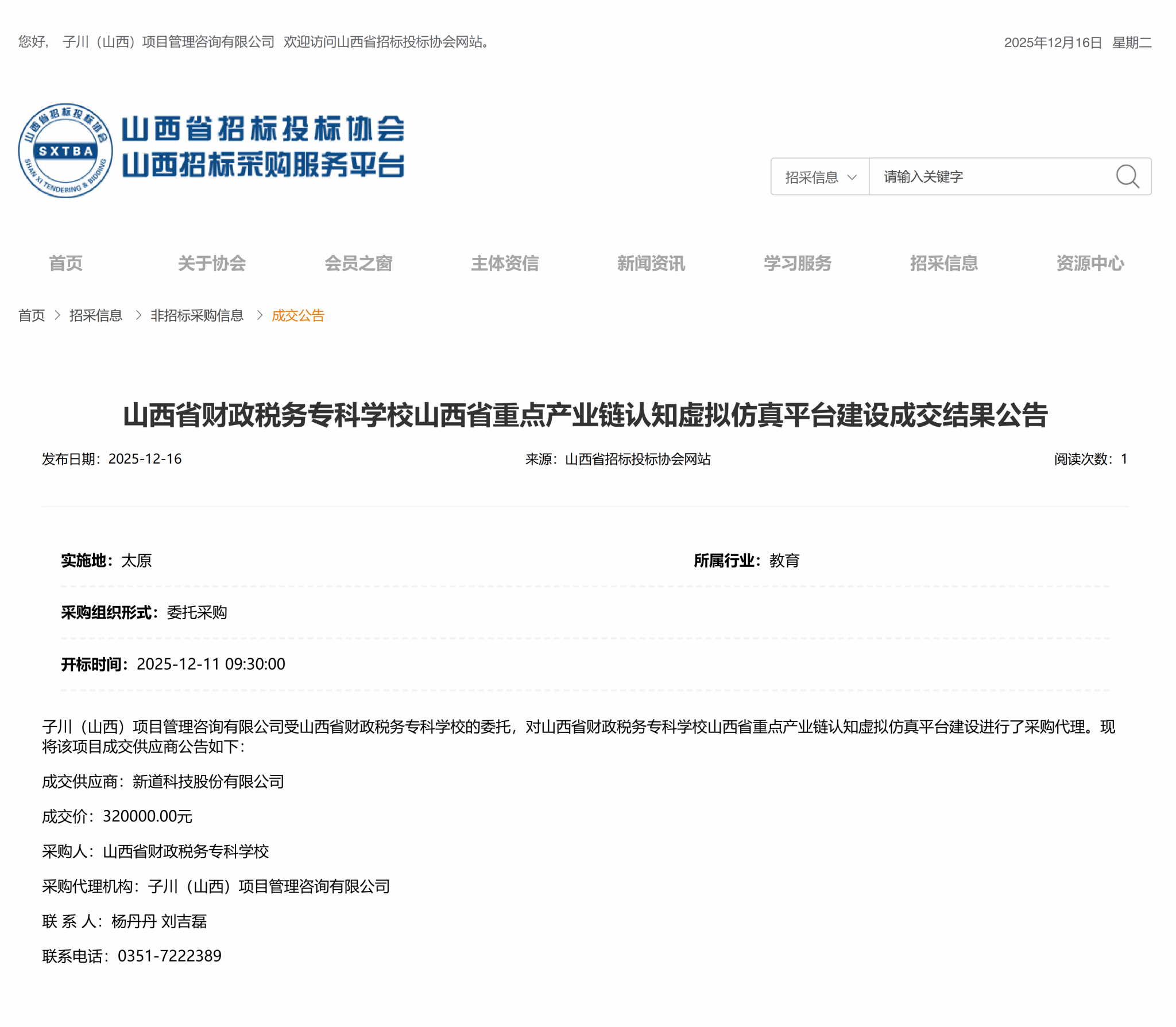 2025年12月4日,子川(山西)项目管理咨询有限公司受我校委托,对我校“重点产业链认知虚拟仿真平台建设”项目进行招标采购。 并于2025年12月16日完成评审工作。 山西省招标投标协会网关于本项目成交结果公告如下: