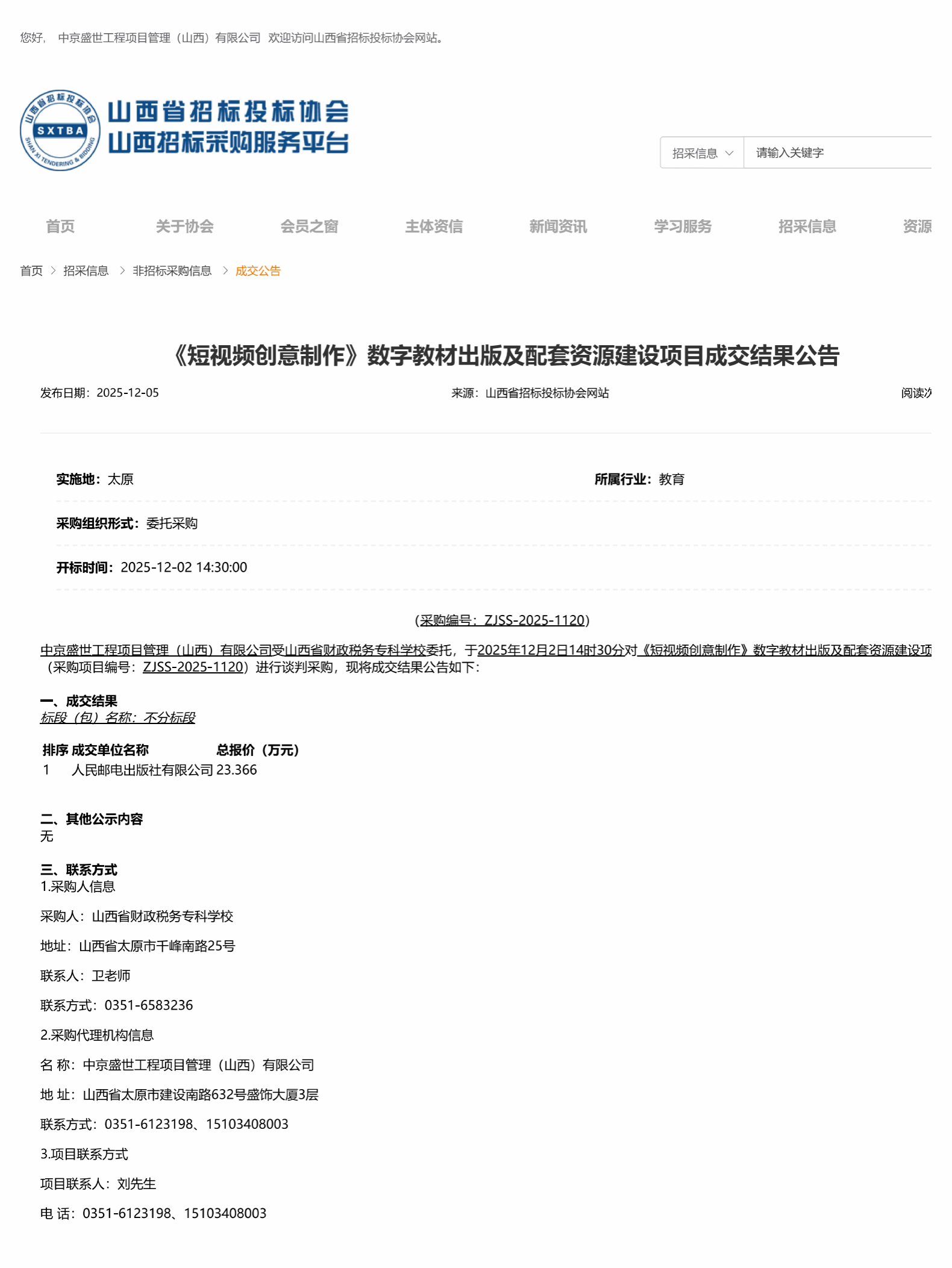 2025年11月26日,中京盛世工程项目管理(山西)有限公司受我校委托,对我校“《短视频创意制作》数字教材出版及配套资源建设”项目进行招标采购。 并于2025年12月5日完成评审工作。 山西省政府采购网关于本项目成交结果公告链接地址如下: